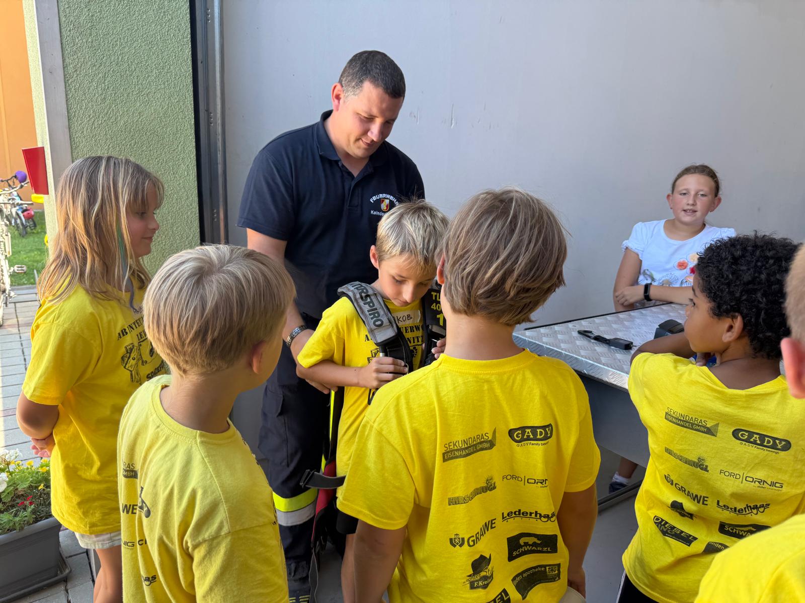 Am 5. August konnten wir eine Gruppe von der Abenteuerwoche Leibnitz bei uns im Feuerwehrhaus begrüßen. Gemeinsam mit den Betreuern kamen die Kids mit den Fahrrädern zu uns ins Feuerwehrhaus. Dort teilten wir uns in zwei Gruppen auf und schauten uns im Detail die Fahrzeuge und Gerätschaften an. Bei einigen Geräten durften die Kinder sogar selbst Hand anlegen und probieren. Nach dem Kennenlernen der Fahrzeuge ging es mit den Fahrzeugen zu unserem Übungsplatz. Hier durften alle Kinder einmal am Strahlrohr stehen und dieses bedienen. Ebenfalls stellten wir das Hydroschild auf, um eine kleine Abkühlung für die Kids zu ermöglichen. Als Highlight durfte jeder einmal den Wasserwerfer am Dach vom TLF bedienen. Danach ging es wieder zurück ins Feuerwehrhaus. Als kleine Erinnerung an den spannenden Nachmittag, bekam jedes Kind zum Abschluss noch ein Rubber-Armband.